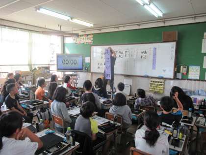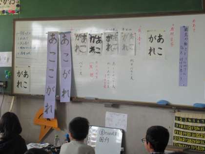 本番では,みんながうまくいかなかったところをもとに,それぞれの文字についてポイントを確認して書きました。さらに,次回も「あこがれ」を書いていきます。見る人に「あこがれられる」字を書いていってほしいと思います!