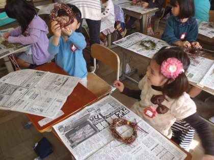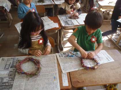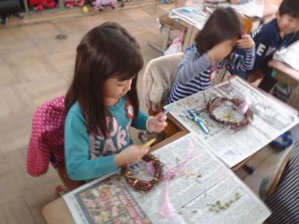 支柱からつるをとるのも一苦労。わっかにして,つるをまきつけて・・・と,みんな悪戦苦闘していましたが,できあがったリースを見てとても嬉しそうでした。
