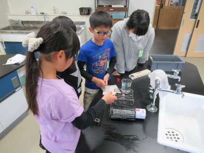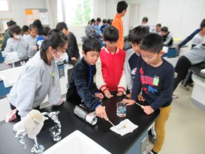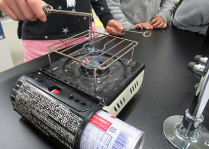 今回の実験は,金属の球を熱するために「ガスコンロ」を使って実験を行いました。火を使う実験でしたが,4年生は使い方をきちんと守って安全第一で実験を行うことができました。