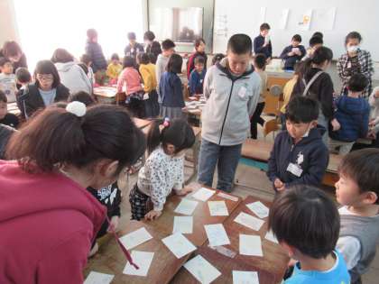 グループになり,楽しみながらカルタを行っていました。