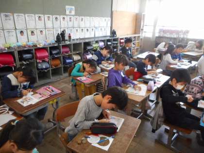 来週23日(火)にある「1年生を迎える会」に向けて,4年生は1年生へのプレゼントを作っています。「どうやったら喜んでくれるかな」「一緒にがんばろう」など,口々に話しながらも丁寧に図画工作に取り組んでいました。