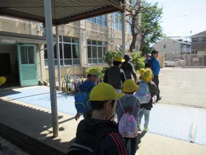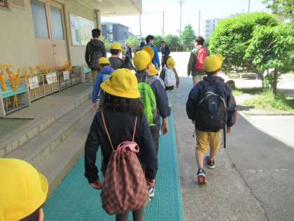 ペアで2列に並び,安全に気をつけて大藪小学校まで行きました。