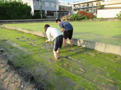 本番の田植えに向けて3年生の先生を中心に田植え準備をしています。苗を準備したり,田植え練習を実際にしてみたり…。今年も稲を育てる季節がいよいよやってきました。