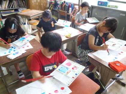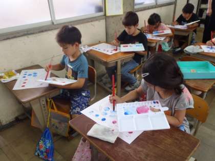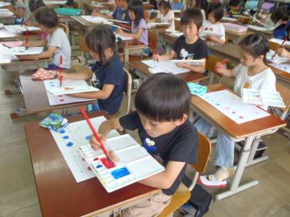 楽しみにしていた,絵の具の学習です。今日は赤色と青色に,少しずつ水をまぜました。水をたすだけで色が変わったとみんな驚いていました。