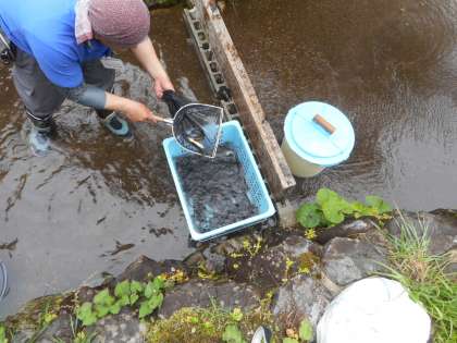 これから山の家の中にあるおがま池で行う「魚つかみ」にむけて,魚を数えました。今は元気に泳いでいます。さわってみるとヌルヌルとして,やはりつかみにくいです。さらにとても素早いです。一人一匹つかまえます。