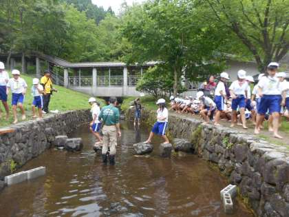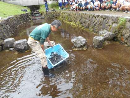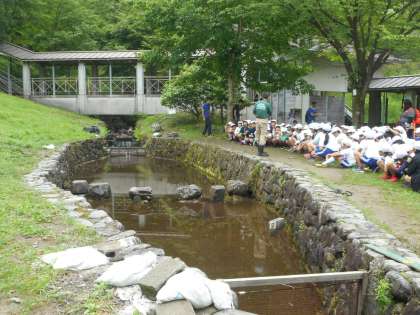 午前中のプログラムのメインは魚つかみ・さばきです。まずは,池に放流された岩魚(イワナ)を撮るところからスタートです。120匹のイワナが勢いよく泳ぎだしました。