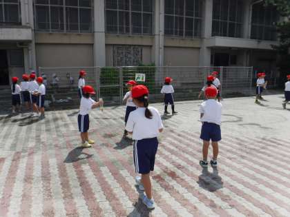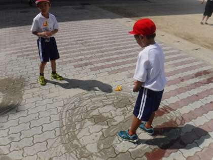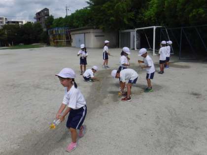 生活の学習で水遊びをしました。アサガオの水やりに使うペットボトルのじょうろを使って,地面に絵を描いたり,シャワーみたいにして遊んだりしました。
