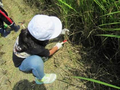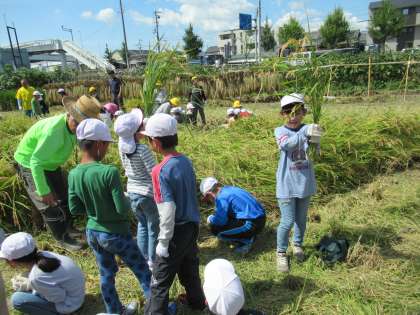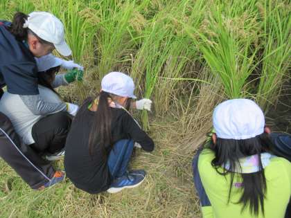 よく実った稲を前に,子どもたちからは初めて体験するわくわく感と,初めて鎌を使うドキドキ感が感じられました。