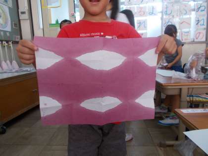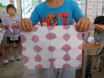 あさがおの花をしぼって,出てきた色水に折りたたんだ和紙を浸して開くと,きれいな模様が出来上がって喜んでいた子どもたちでした。