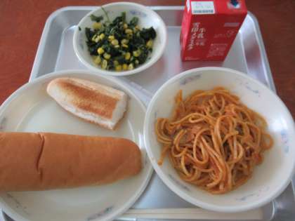 11日(水)の給食は,小型コッペパン,牛乳,ほうれん草のソテー,イタリアンスパゲティでした。イタリアンスパゲティは,見た目はきゅうりに似ていますがかぼちゃの仲間であるズッキーニも入った大人気のメニューでした。
