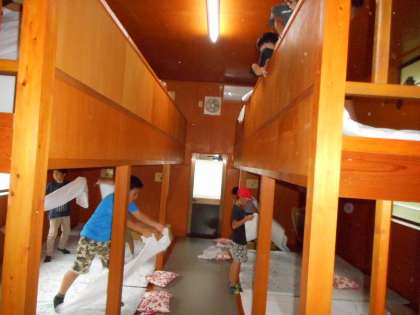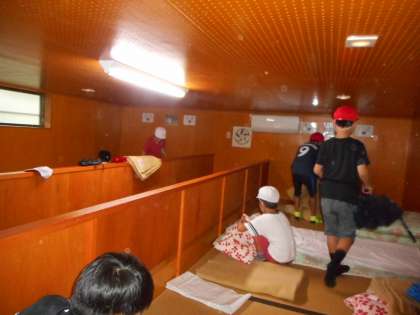 今日の寝る場所ですが,雨のためテントが使用できません。女子は90畳でみんなで寝ます。男子は予定通りバンガローで寝ます。バンガローは2階建てとなっていて,それだけでも子どもたちはテンションがあがっているようです。