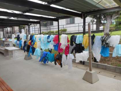 雨の中,所内をぐるーっと一周回ってきました。レインコートも濡れたので,帰ってきた子から干しました。風も少し強いので,とばされないように洗濯バサミを使ってはさんでいます。