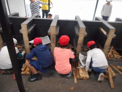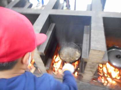 がんばれかまど係の子どもたち。けむりに負けるな〜。火が通ってきたら,お鍋の中身をまぜましょう。