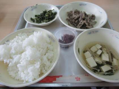 メニューは,ごはん・だいこんばのごまいため・ぎゅうにくとれんこんのにつけ・すましじる・しばづけでした。中でも京都の三大漬物の一つであるしばづけは,左京区の大原で昔から作られてきました。なすと赤じそと塩だけを使って,昔ながらの方法で作られたしばづけでした。ごはんととても良く合っていて,おいしくいただきました。