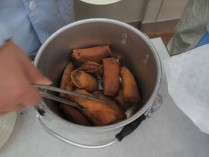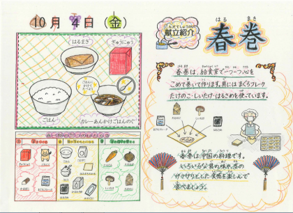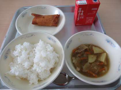 4日(金)の給食は,ごはん・牛乳・カレーあんかけごはんの具・春巻でした。