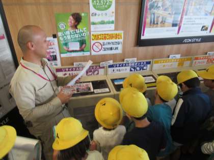 鮮魚売場,卵・牛乳売場,野菜・果物売場,リサイクルボックスの4か所でそれぞれ説明をしていただきました。子どもたちは熱心にメモを取りながら,一生懸命働いている方からのお話を聞いていました。