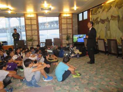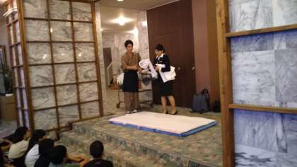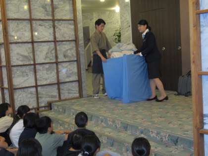 ホテルでは入館式を行いました。ホテルの方からは布団の敷き方を教えていただきました。二人で協力して布団を敷いてほしいと思います。