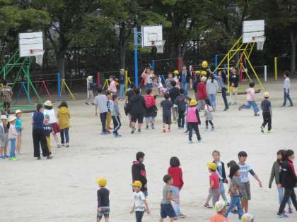 今回は赤組・白組が教室,青組・黄組が運動場でなかよし遊びを行いました。
