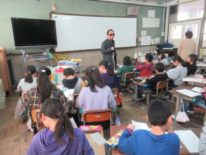 1時間目はふれあいサロンで4年生全体でお話を聞きました。2時間目以降は各クラスで点字を打つ体験をしました。