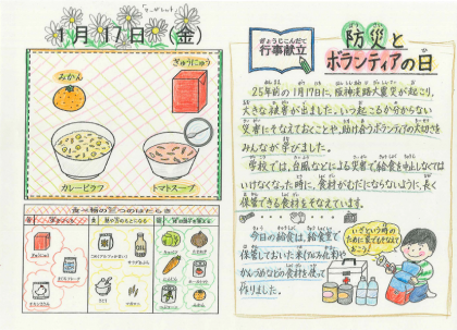 今から25年前,阪神淡路大震災が起こりました。学校では,台風などによる災害で給食を中止しなくてはいけなくなったときに食材がむだにならないように長く保管できる食材をそなえています。この日の給食は,給食室で保管しておいた米(アルファ化米)や缶詰めなどの食材を使って作りました。