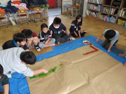 初めに,森をイメージした地面を作るため,ローラーで色塗りをしました。茶色やこげ茶色,緑色など,大藪小学校の子どもたちとも力を合わせて,上手に色塗りをすることができました。