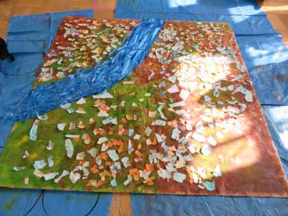 続いて,事前にマーブリングで作った画用紙をちぎり,地面に貼りつけました。
