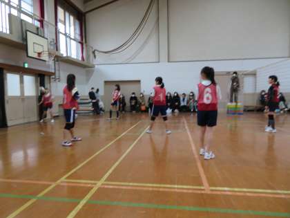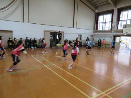 子どもたちは,サーブが右にそれてアウトになってしまったから少し左の位置からサーブをしたり,相手から強いサーブが来るので少し後ろの位置に守ってレシーブをしようとしたりとどちらのチームも試合の中で工夫を行う様子が様々な場面で見られました。
