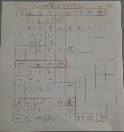 みなさんも,ぜひ,さんぽなどで出かけたときに,おうちのまわりの「はる」を見つけてください。学校がはじまったら,それをおしえてくれるとうれしいです。
