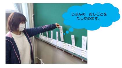 きゅうしょくが はじまったら じぶんの とうばんを かくにんして みんなのために おしごとをします。