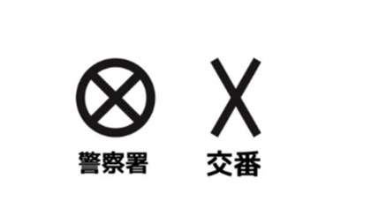 交番は警棒(けいぼう)を2本,組み合わせた記号です。このように意味を考えるとおぼえやすいと思います。そして,地域の大きな署には交番の記号を「丸」で囲んだ形でできています。