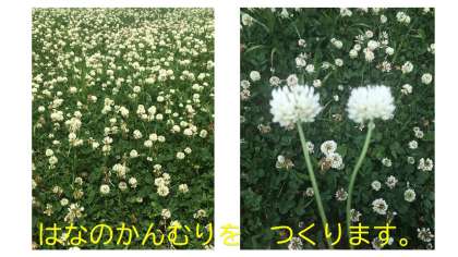 まえ さんぽをしたときに 「しろつめくさ」が たくさんさいている ところを みつけたので 「はなかんむりを つくろう。」と きめて でかけることに しました。