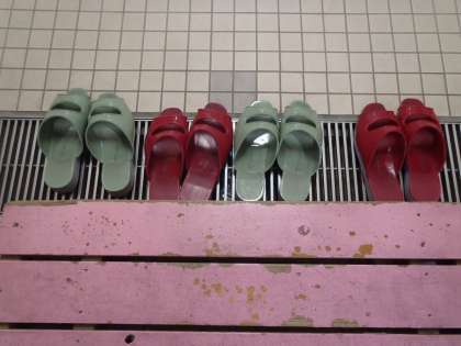 1ねんせいのみなさんが つかうといれを みると すりっぱが とても きれいに ならんで いました。