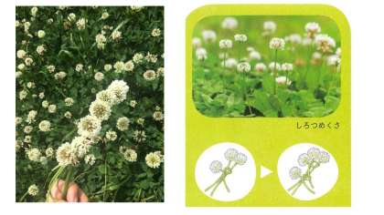 しろつめくさを つんで はなかんむりを つくっていたら 「あかつめくさ」という はなも みつけたので いっしょに あんでいきました。ぴんくいろのはなが 「あかつめくさ」です。