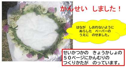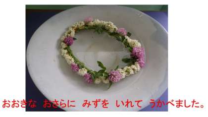 いえでは おおきいおさらに みずをいれて はなかんむりを うかべました。