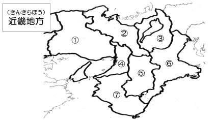 それぞれの都道府県がどこにあるのか,下の近畿地方(きんきちほう)の地図の中からさがしてみてください。