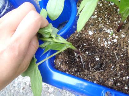 写真の2枚目のように,根のまわりを指で掘って,やさしく引き抜いてください。(根の部分がよく見えるように,写真では葉の部分を持っていますが,引き抜くときは茎の部分を持つと抜きやすいです。)