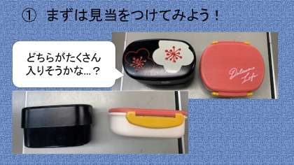 教科書16ページから19ページを見ながら,先生たちのお弁当箱の体積を求めてみよう!