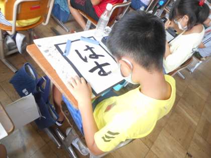 めあては「結びの筆使いに気を付けて書く」です。今回のひらがなでは,「たて結び」と「横結び」(丸い部分)を頑張って書きました。最初に試し書きをしたときは結びが真ん丸で,筆を回して書く子どもが多かったのですが,授業を進めていくうちに止めながら三角形を意識して書くことができました。