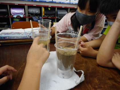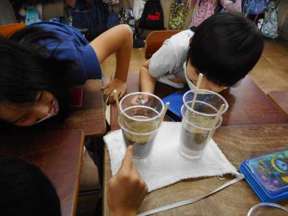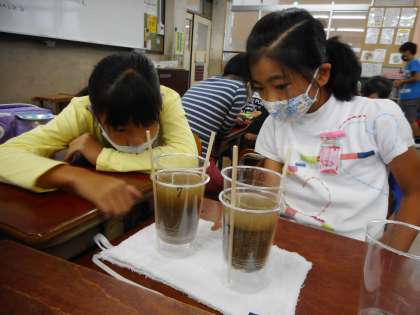 子どもたちからは,「砂利のほうがしみこむ早さが早い。」「砂のほうが下に落ちてくる水がきれいになっている。」など,じっくりと観察したことを結果としてまとめることができました。また,実験結果から「浄水場の水をきれいにしている仕組みに似ている。」という意見も出て,社会科の学習と結び付けて考えている姿も見られました。