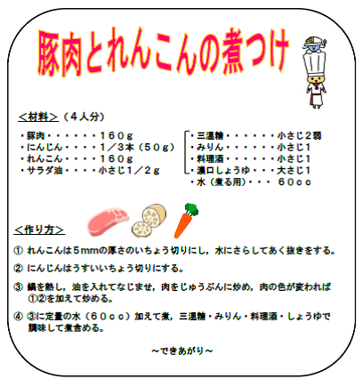 今日紹介する献立は,今日の給食に登場した「豚肉とれんこんの煮つけ」です。