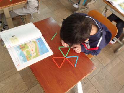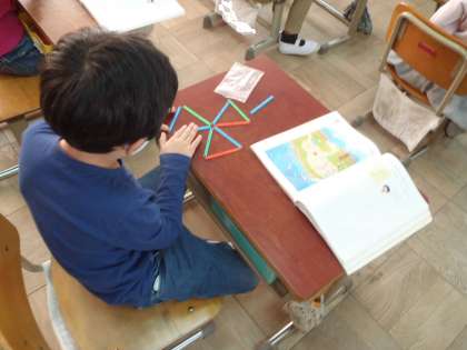 三角形の色板や,ぼうを使って,いろいろな形を作っています。