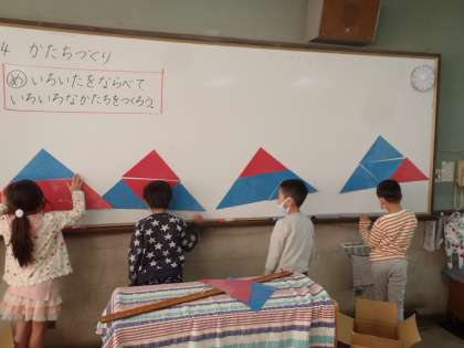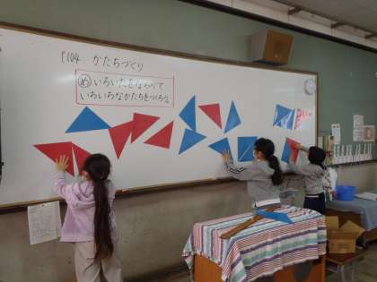 三角形の色板を使って作った形を,発表しました。