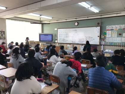 子どもたちは,映像やスライドの資料を食い入るように見ており,