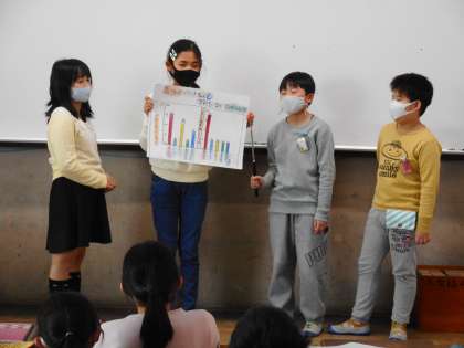 この班では,「5つのハートちゃん(あいさつ)(歩こう)(聞こう)(きれいに)(時間を大切に)を守れているか」「5つのハートちゃんで,特に意識していることは何か。」をテーマにアンケートを取りました。調査結果から,あいさつをすることと,廊下などを歩くということが一番実現度が高いということと,子どもたちが特に意識している項目も「あいさつ」「あるこう」と同じ項目が一番多いということがわかりました。調査結果から,意識して行動することで実現度は高くなるということがわかりました。最後にこの班は,残りの項目も意識して行動することを提案していました。