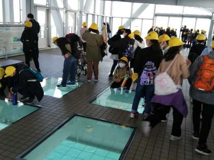 渦の道での見学タイム。すけすけガラスの上を通るときは,いつもひやひやしますね。