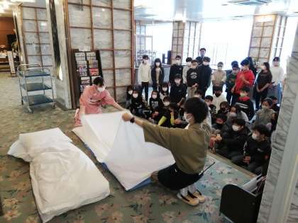 例年は全員で布団の敷き方について説明を受けていましたが,今年は代表が説明を聞き,各部屋の児童へ伝える方法に変更になりました。