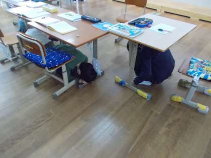 先日,シェイクアウト訓練に参加しました。緊急地震速報について知ったり,地震が起きた際に自分の身の守り方について考えたりしました。