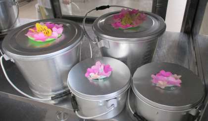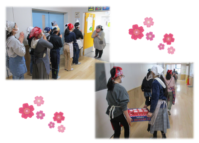 おかずを入れる「食缶」のふたには,給食調理員さんが手作りの桜の花びらを貼ってくださいました!