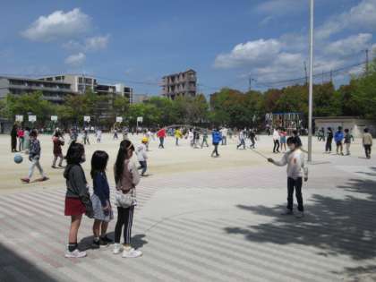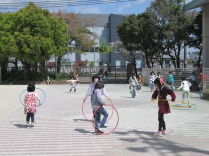運動場ではボールあそびやおにごっこ,インターブロックでは大縄や一輪車,縄跳び,フラフープなどが流行っています。