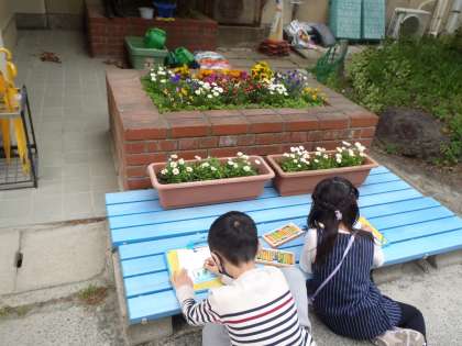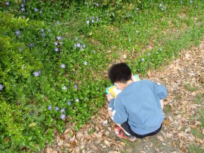たんぽぽやパンジーを見つけて,絵に表していました。
